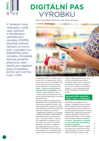 PAVLA CIHL%u00c1%u0158OV%u00c1, %u0158EDITELKA, GS1 CZECH REPUBLICDIGIT%u00c1LN%u00cd PASV%u00ddROBKUV lo%u0148sk%u00e9m roce vstoupilo v platnost na%u0159%u00edzen%u00edo ekodesignuudr%u017eiteln%u00fdch v%u00fdrobk%u016f (ESPR). Sou%u010d%u00e1st%u00ed tohoto na%u0159%u00edzen%u00ed je mimo jin%u00e9 i zaveden%u00ed tzv. digit%u00e1ln%u00edho pasu v%u00fdrobku. Evropsk%u00e1 komise pov%u011b%u0159ila p%u0159%u00edpravou standard%u016f pro digit%u00e1ln%u00ed pasy Evropskou komisi pro normalizaci, CEN.Organizace GS1 je v tomto procesu aktivn%u00ed a je zapojena do v%u0161ech pracovn%u00edch skupin prost%u0159ednictv%u00edm sv%u00fdch expert%u016f na %u00farovni jednotliv%u00fdch n%u00e1rodn%u00edch normaliza%u010dn%u00edch %u00fa%u0159ad%u016f. C%u00edlem je obh%u00e1jit politiku jednoho k%u00f3du na produktu a maxim%u00e1ln%u011b vyu%u017e%u00edt benefit%u016f, kter%u00e9v relevantn%u00edch pr%u016fmyslov%u00fdch sektorech p%u0159in%u00e1%u0161%u00ed dlouholet%u00e9 vyu%u017e%u00edv%u00e1n%u00ed standard%u016f GS1.Ve h%u0159e je nejenom jednozna%u010dn%u00e1 identifikace (a%u0165 u%u017e produktu nebo samotn%u00e9ho digit%u00e1ln%u00edho pasu), ale tak%u00e9 po%u017eadavek propojen%u00ed fyzick%u00e9ho produktu se %u0161irok%u00fdm portfoliem informac%u00ed, kter%u00e9 jsou ulo%u017eenyv digit%u00e1ln%u00edm prost%u0159ed%u00ed a je pot%u0159eba je sd%u00edlet zp%u016fsobem odpov%u00eddaj%u00edc%u00edm legislativ%u011b. Oba tyto po%u017eadavky jsou v souladu s jedn%u00edm z prioritn%u00edch glob%u00e1ln%u00edch program%u016f GS1pro retail. Ten po%u010d%u00edt%u00e1 s plo%u0161nou akceptac%u00ed 2D k%u00f3d%u016f s podporouGS1 Digit%u00e1ln%u00edho linku od roku 2027. Ve stejn%u00e9m roce se po%u010d%u00edt%u00e1se zaveden%u00edm prvn%u00ed skupiny digit%u00e1ln%u00edch pas%u016f do obchodn%u00ed praxe. P%u016fjde o elektrobaterie, kde jsouji%u017e d%u00e1ny p%u0159esn%u011bj%u0161%u00ed specifikacena%u0159%u00edzen%u00edm 2023/1542 o bateri%u00edcha odpadn%u00edch bateri%u00edch. Po%u017eadovanou %u00farovn%u00ed detailu identifikace bude p%u0159i vyu%u017eit%u00ed standardu GS1 GTIN v kombinaci se s%u00e9riov%u00fdm %u010d%u00edslem.P%u0159edev%u0161%u00edm je pot%u0159eba m%u00edt na pam%u011bti, %u017ee digit%u00e1ln%u00ed pas v%u00fdrobku (DPP, Digital Product Passport) je p%u0159ipravov%u00e1n jako komplexn%u00ed evropsk%u00fd syst%u00e9m propojuj%u00edc%u00ed v%u00fdrobce, obchodn%u00edky, z%u00e1kazn%u00edky, dozorov%u00e9 org%u00e1ny, recykla%u010dn%u00ed pr%u016fmysl, p%u0159%u00edpadn%u011b dal%u0161%u00ed hr%u00e1%u010de v r%u00e1mci cel%u00e9ho hodnotov%u00e9ho %u0159et%u011bzce vybran%u00fdch produkt%u016f. Rozhodn%u011b se nejedn%u00e1o pouh%u00fd k%u00f3d nebo identifik%u00e1torna obalu produktu.Pokud zaveden%u00ed syst%u00e9mu digit%u00e1ln%u00edch pas%u016f pro n%u00e1zornost hodn%u011b zjednodu%u0161%u00edme, je mo%u017en%u00e9 si p%u0159edstavit, %u017ee ka%u017ed%u00fd v%u00fdrobce, resp. EKOSYST%u00c9M DIGIT%u00c1LN%u00cdHO PASU V%u00ddROBKUFOTO: ARCHIV GS114