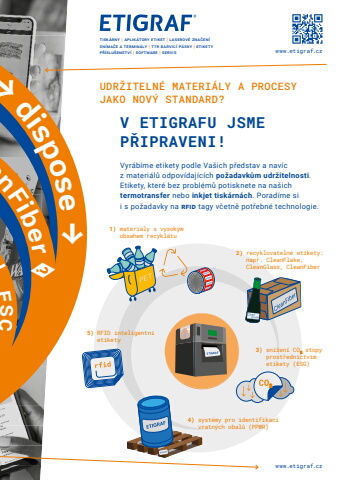 TISK%u00c1RNY | APLIK%u00c1TORY ETIKET | LASEROV%u00c9 ZNA%u010cEN%u00cd SN%u00cdMA%u010cE A%u00a0TERMIN%u00c1LY | TTR BARVIC%u00cd P%u00c1SKY | ETIKETY P%u0158%u00cdSLU%u0160ENSTV%u00cd | SOFTWARE | SERVISVyr%u00e1b%u00edme etikety podle Va%u0161ich p%u0159edstav a nav%u00edc z materi%u00e1l%u016f odpov%u00eddaj%u00edc%u00edch po%u017eadavk%u016fm udr%u017eitelnosti. Etikety, kter%u00e9 bez probl%u00e9m%u016f potisknete na na%u0161ich termotransfer nebo inkjet tisk%u00e1rn%u00e1ch. Porad%u00edme si i s po%u017eadavky na RFID tagy v%u010detn%u011b pot%u0159ebn%u00e9 technologie.UDR%u017dITELN%u00c9 MATERI%u00c1LY A PROCESY JAKO NOV%u00dd STANDARD?V ETIGRAFU JSME P%u0158IPRAVENI!5) RFID inteligentn%u00ed etikety4) syst%u00e9my pro identifikaci vratn%u00fdch obal%u016f (PPWR)3) sn%u00ed%u017een%u00ed CO2 stopy prost%u0159ednictv%u00edm etikety (ESG)www.etigraf.czwww.etigraf.cz%u2192dispose%u2192nFiber%ufffdFSC1) materi%u00e1ly s vysok%u00fdmobsahem recykl%u00e1tu2) recyklovateln%u00e9 etikety:nap%u0159. CleanFlake, CleanGlass, CleanFiber