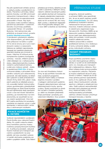 FOTO: ARCHIV GS1Na ja%u0159e spole%u010dnost%u00ed ot%u0159%u00e1sla zpr%u00e1va o v%u00fdskytu osoby s podez%u0159en%u00edm na ebolu. Pacienta s p%u0159%u00edznaky nebezpe%u010dn%u00e9 choroby s a%u017e 90% smrtnost%u00edzdravotn%u00edci transportovali z t%u00e1borsk%u00e9 nemocnice na specializovan%u00e9pracovi%u0161t%u011b v Praze. Aby bylo vylou%u010deno riziko roz%u0161%u00ed%u0159en%u00ed n%u00e1kazy, pacient byl p%u0159ev%u00e1%u017een v izola%u010dn%u00edm biovaku na principu podtlaku vybaven%u00e9m filtrac%u00ed. C%u00edl: pra%u017esk%u00e1 Bulovka. Vn%u011b nemocnice zde p%u0159ibli%u017en%u011b za dvacet minut vyrostlo mobiln%u00ed l%u00e9ka%u0159sk%u00e9 pracovi%u0161t%u011b.S koridorem vybaven%u00fdm v%u00e1le%u010dkov%u00fdm dopravn%u00edkem, po n%u011bm%u017e pacienta p%u0159esunuli na l%u016f%u017eko a vy%u0161et%u0159ili ho skrze otvory pro ruce s bari%u00e9rov%u00fdmi ruk%u00e1vci a rukavicemi. N%u00e1kaza se na%u0161t%u011bst%u00ed neprok%u00e1zala. Naopak byl %u00fasp%u011b%u0161n%u011b otestov%u00e1n speci%u00e1ln%u00ed postup pro krizov%u00e9 situace. V%u0161echny t%u0159i kl%u00ed%u010dov%u00e9 prvky komplexn%u00edho syst%u00e9mu biologick%u00e9 ochrany %u2013 biovak, infek%u010dn%u00ed pracovi%u0161t%u011b skl%u00e1daj%u00edc%u00ed se z nafukovac%u00edho stanu, dekontamina%u010dn%u00edho modulu, izola%u010dn%u00ed a p%u0159echodov%u00e9 komory a pl%u00e1n pro rizikov%u00fd sc%u00e9n%u00e1%u0159 %u2013 dodala spole%u010dnost EGO Zl%u00edn. K tomu ochrann%u00e9 obleky s p%u0159%u00edvodem filtrovan%u00e9ho vzduchu pro zdravotnick%u00fd person%u00e1l, ale tak%u00e9 batohy na l%u00e9ka%u0159sk%u00e9 vybaven%u00ed a dal%u0161%u00ed p%u0159%u00edslu%u0161enstv%u00ed.Otcem firmy EGO Zl%u00edn, jako%u017e i %u0159ady jej%u00edch patent%u016f je n%u011bkdej%u0161%u00ed pracovn%u00edk a pozd%u011bji %u0159editel V%u00fdzkumn%u00e9ho %u00fastavu gum%u00e1rensk%u00e9 a plastik%u00e1%u0159sk%u00e9 technologie ve Zl%u00edn%u011b Pavel Kostka. Na poli aplikovan%u00e9 v%u011bdy spolupracoval s v%u00edce ne%u017e t%u0159iceti n%u00e1rodn%u00edmi podniky, po transformaci na tr%u017en%u00ed ekonomiku se soust%u0159edil na rozvoj vlastn%u00ed spole%u010dnosti. V%u00edce ne%u017e 80 % jej%u00edho portfolia %u010din%u00ed produkty zalo%u017een%u00e9 na vlastn%u00edm v%u00fdvoji v %u00fazk%u00e9 spolupr%u00e1ci s nemocnicemi, arm%u00e1dou a z%u00e1chrann%u00fdmi slu%u017ebami. Sv%u011btov%u011b nejzn%u00e1m%u011bj%u0161%u00edm vyn%u00e1lezem Pavla Kostky jsou vakuov%u00e9 fixa%u010dn%u00ed dlahy. Po vys%u00e1t%u00ed vzduchu obemknou kon%u010detinu pevnou masou tvo%u0159enou polystyrenov%u00fdmi kuli%u010dkami. A p%u0159%u00edbuzn%u00fd produkt, vakuov%u00e9 fixa%u010dn%u00ed matrace pro transport pacient%u016f s podez%u0159en%u00edm na %u00faraz p%u00e1te%u0159e, je%u017e jsou sou%u010d%u00e1st%u00ed vybaven%u00ed ka%u017ed%u00e9 z%u00e1chranky prakticky po cel%u00e9m vysp%u011bl%u00e9m sv%u011bt%u011b. Toto %u0159e%u0161en%u00ed p%u0159edstavuje kriticky d%u016fle%u017eit%u00fd prvek v p%u00e9%u010di o pacienty s t%u011b%u017ek%u00fdmi %u00farazy, nebo%u0165 k v%u011bt%u0161in%u011b nevratn%u00fdch po%u0161kozen%u00ed p%u00e1te%u0159e doch%u00e1z%u00ed p%u0159i transportu.K n%u00e1padu akademika inspirovala vakuov%u00e1 balen%u00ed k%u00e1vy, kter%u00e1 se dostala na trh na konci 80. let; tvary dlah vznikly v ateli%u00e9rech legend%u00e1rn%u00edho Pr%u016fmyslov%u00e9ho designu Zl%u00ednv roce 1987 a dodnes se nezm%u011bnily.Za v%u00edce ne%u017e t%u0159icetiletou historii firmy se jej%u00ed portfolio rozrostlo do %u0159ady v%u00fdrobn%u00edch program%u016f.Vakuov%u00e9 fixa%u010dn%u00ed dlahy a matrace doplnilo mno%u017estv%u00ed v%u00fdrobk%u016fv kategorii z%u00e1chrann%u00fdch syst%u00e9m%u016f. Program dekontaminace zahrnuje dekontamina%u010dn%u00ed kruhy, sprchya stany. %u0160irok%u00fd sortiment je zam%u011b%u0159en na p%u00e9%u010di o imobiln%u00ed pacientya z d%u00edlen na zl%u00ednsk%u00e9m p%u0159edm%u011bst%u00ed%u0160t%u00edpa poch%u00e1zej%u00ed i produkty pro veterin%u00e1rn%u00ed l%u00e9ka%u0159stv%u00ed. Dva v%u00fdrobn%u00ed programy, stanov%u00e9 syst%u00e9mya ochrana CBRN, jsou specifick%u00e9 t%u00edm, %u017ee se na jejich realizaci pod%u00edl%u00ed%u0159ada subdodavatel%u016f. Tzv. EU stany p%u0159edstavuj%u00ed modul%u00e1rn%u00ed sestavy nafukovac%u00edch hal pro poln%u00ed nemocnice, mobiln%u00ed o%u010dkovac%u00ed centra %u010di z%u00e1zem%u00ed pro organizace typu %u010cerven%u00fd k%u0159%u00ed%u017e. Portfolio CBRN se se stanov%u00fdmi syst%u00e9my %u010d%u00e1ste%u010dn%u011b p%u0159ekr%u00fdv%u00e1: pat%u0159%u00ed sem dekontamina%u010dn%u00ed stany pro arm%u00e1du i civiln%u00ed pou%u017eit%u00ed, mobiln%u00ed odb%u011brov%u00e1 centra,infek%u010dn%u00ed pracovi%u0161t%u011b a izola%u010dn%u00ed podtlakov%u00e9 komory (tzv. bioboxy). K tomu ochrann%u00e9 obleky a dal%u0161%u00ed prvky individu%u00e1ln%u00ed ochrany.Popis portfolia uzav%u0159eme vlajkovou lod%u00ed, kter%u00e1 generuje v%u011bt%u0161inu obratu a vyv%u00e1%u017e%u00ed se do sedmdes%u00e1ti zem%u00ed, tzv. biovaky pro transport lid%u00ed s nebezpe%u010dnou n%u00e1kazou. Roz%u0161%u00ed%u0159en%u00ed infekce br%u00e1n%u00ed princip podtlaku nas%u00e1v%u00e1n%u00edm vzduchu. Pacienta je mo%u017eno o%u0161et%u0159ovat skrze t%u0159i p%u00e1ry otvor%u016f s ruk%u00e1vci, napojit jej na d%u00fdchac%u00ed p%u0159%u00edstroj pomoc%u00ed speci%u00e1ln%u00edho portu %u010di mu aplikovat infuze, EKG apod. Hlavn%u00ed konkuren%u010dn%u00ed v%u00fdhoda spo%u010d%u00edv%u00e1 v lehkosti a skladnosti biovaku. Dal%u0161%u00ed sv%u011btov%u011b nejroz%u0161%u00ed%u0159en%u011bj%u0161%u00ed koncept toti%u017e p%u0159edstavuje lamin%u00e1tov%u00fd, relativn%u011b t%u011b%u017ek%u00fd a h%u016f%u0159emanipulovateln%u00fd prost%u0159edek,zat%u00edmco zl%u00ednsk%u00e1 inovace umo%u017e%u0148uje transport biovaku z textilieFIXACE KON%u010cETINA P%u00c1TE%u0158ENOSN%u00dd PROGRAM: BIOVAKY35