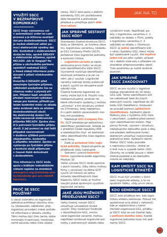 U zbo%u017e%u00ed lo%u017een%u00e9ho na logistick%u00e9 jednotce pot%u0159ebuj%u00ed v%u0161echny strany (dodavatel, odb%u011bratel, p%u0159%u00edp. logistick%u00fd provider) z%u00edskat pot%u0159ebn%u00e9 informace o obsahu z%u00e1silky. T%u011bmi mohou b%u00fdt %u010d%u00edslo %u0161ar%u017ee, doba minim%u00e1ln%u00ed trvanlivosti, hmotnost, zem%u011b p%u016fvodu nebo %u010d%u00edslo objedn%u00e1vky. SSCC k%u00f3d spolu s dal%u0161%u00edmi standardy GS1 jim po%u017eadovan%u00e1 data bezpe%u010dn%u011b a jednodu%u0161e p%u0159ed%u00e1v%u00e1 a umo%u017e%u0148uje jejich efektivn%u00ed sd%u00edlen%u00ed.Standardn%u00ed %u010d%u00edseln%u00e1 struktura SSCC k%u00f3du je 18m%u00edstn%u00e1. Je tvo%u0159ena zleva tzv. logistickou variantou, n%u00e1sleduje GS1 Company Prefix (GCP), po%u0159adov%u00e9 %u010d%u00edslo logistick%u00e9 jednotky a kontroln%u00ed %u010d%u00edslice.%u2022 Logistick%u00e1 varianta je reprezentov%u00e1na prvn%u00ed %u010d%u00edslic%u00ed ve struktu%u0159e identifika%u010dn%u00edho kl%u00ed%u010de SSCC. V%u00fdznamn%u011b roz%u0161i%u0159uje identifika%u010dn%u00ed mo%u017enosti emitenta a je jen na n%u011bm, jak ji vyu%u017eije. Logistick%u00e9varianty nab%u00edzej%u00ed %u0161irok%u00fd potenci%u00e1la jejich vyu%u017eit%u00ed se v%u011bnujeme podrobn%u011bji n%u00ed%u017ee. %u010c%u00edseln%u00e1 hodnota logistick%u00e9 varianty m%u016f%u017ee b%u00fdt 0%u20139. Pou%u017eit%u00ed nuly nedoporu%u010dujeme, proto%u017ee n%u011bkter%u00e9 informa%u010dn%u00ed syst%u00e9my ji mohou %u201eu%u0159%u00edznout%u201c a t%u00edm strukturu zm%u011bnit na 17m%u00edstnou, tedy neplatnou.A s jej%u00edm dal%u0161%u00edm zpracov%u00e1n%u00edm mohou m%u00edt probl%u00e9my.%u2022 N%u00e1sleduje GS1 Company Prefix. GCP p%u0159edstavuje jedine%u010dnou identifikaci spole%u010dnosti. Skl%u00e1d%u00e1 sez p%u0159ed%u010d%u00edsl%u00ed %u010cesk%u00e9 republiky 859a n%u00e1sleduj%u00edc%u00edho %u010dty%u0159- a%u017e %u0161estim%u00edstn%u00e9ho identifika%u010dn%u00edho %u010d%u00edsla registrovan%u00e9 firmy.%u2022 Dal%u0161%u00ed je po%u0159adov%u00e9 %u010d%u00edslo logistick%u00e9 jednotky. Doporu%u010dujeme jej p%u0159id%u011blovat v%u017edy vzestupn%u011b.%u2022 Sekvenci uzav%u00edr%u00e1 kontroln%u00ed %u010d%u00edslice vypo%u010dten%u00e1 podle algoritmu Modulo 10.Velk%u00e1 v%u00fdhoda SSCC k%u00f3d%u016f spo%u010d%u00edv%u00e1 v jejich rozsahu. D%u00edky n%u011bmu mohou firmy v z%u00e1vislosti na d%u00e9lce GCP vyu%u017e%u00edt 10 milion%u016f a%u017e jednu miliardu identifika%u010dn%u00edch %u010d%u00edsel. Kapacitu SSCC k%u00f3du je mo%u017eno nav%u00fd%u0161it pr%u00e1v%u011b spr%u00e1vn%u00fdm vyu%u017eit%u00edm logistick%u00e9 varianty.Velk%u00fd %u010d%u00edseln%u00fd rozsah SSCC umo%u017e%u0148uje u%u017eivatel%u016fm %u0161irok%u00e9 vyu%u017eit%u00ed. D%u00edky roz%u0161i%u0159uj%u00edc%u00ed hodnot%u011bv identifika%u010dn%u00edm kl%u00ed%u010di, zmi%u0148ovan%u00e9 logistick%u00e9 variant%u011b, mohou nap%u0159%u00edklad rozli%u0161ovat logistick%u00e9 jednotky z jednotliv%u00fdch sklad%u016f nebov%u00fdrobn%u00edch linek. Nap%u0159%u00edklad: palety s logistickou variantou %u010d. 1 odj%u00ed%u017ed%u011bj%u00ed ze skladu v Plzni, paletys logistickou variantou %u010d. 3 odj%u00ed%u017ed%u011bj%u00ed ze skladu v Olomouci.SSCC je jedin%u00fd identifika%u010dn%u00ed kl%u00ed%u010dv r%u00e1mci Syst%u00e9mu GS1, kter%u00fd m%u016f%u017ee b%u00fdt opakovan%u011b vyu%u017eit. Ale nejd%u0159%u00edve jeden rok po jeho vyd%u00e1n%u00ed, p%u0159%u00edpadn%u011b v del%u0161%u00edm intervalu s ohledem na charakter p%u0159epravovan%u00e9ho zbo%u017e%u00ed. Tuto podm%u00ednku je nutn%u00e9 striktn%u011b dodr%u017eet.SSCC se pro vyu%u017eit%u00ed v logistice k%u00f3duje standardn%u011b do 1D k%u00f3du GS1-128. Tento identifika%u010dn%u00ed kl%u00ed%u010d lze zak%u00f3dovat tak%u00e9 do jin%u00fdch datov%u00fdch nosi%u010d%u016f, nap%u0159%u00edklad do 2D k%u00f3du GS1 DataMatrix. K%u00f3dov%u00e1n%u00ed se prov%u00e1d%u00ed pomoc%u00ed aplika%u010dn%u00edch identifik%u00e1tor%u016f. Aplika%u010dn%u00ed identifik%u00e1tory jsou v Syst%u00e9mu GS1 %u010d%u00edsla v z%u00e1vork%u00e1ch, uv%u00e1d%u011bn%u00e1 p%u0159ed samotn%u00fdm identifika%u010dn%u00edm kl%u00ed%u010dem. Maj%u00ed pevn%u00fd form%u00e1t, v%u00fdznam i strukturu n%u00e1sleduj%u00edc%u00edho datov%u00e9ho pole a d%u00edky sv%u00e9 p%u0159edem definovan%u00e9 funkci skener%u016fm umo%u017e%u0148uj%u00ed rozpozn%u00e1vat jednotliv%u00e1 data. Aplika%u010dn%u00ed identifik%u00e1tor SSCC k%u00f3du pozn%u00e1tes naprostou jistotou. Jedn%u00e1 seo dv%u011b nuly a vypad%u00e1 takto: (00). Z%u00e1vorky se uv%u00e1d%u011bj%u00ed pouze v okem %u010diteln%u00e9 podob%u011b a do datov%u00e9ho nosi%u010de se nek%u00f3duj%u00ed.SSCC mus%u00ed b%u00fdt um%u00edst%u011bn v doln%u00ed sekci logistick%u00e9 etikety, a to na spodn%u00edm %u0159%u00e1dku, v%u017edy prvn%u00ed zleva.SSCC k%u00f3d p%u0159id%u011bluje ten, kdo logistickou etiketu sestavuje. Pokud m%u00e1 spole%u010dnost sv%u016fj sklad v zahrani%u010d%u00ed,kde je registrov%u00e1na u tamn%u00ed %u010dlensk%u00e9 organizace GS1, p%u0159id%u011bluje SSCC k%u00f3d ze sv%u00e9 %u010d%u00edseln%u00e9 %u0159ady s prefixem dan%u00e9ho st%u00e1tu. Ka%u017ed%u00e1 logistick%u00e1 jednotka mus%u00ed m%u00edt jedine%u010dn%u00fd SSCC.05JAK SPR%u00c1VN%u011a SESTAVIT SSCC K%u00d3D?PRO%u010c SE SSCC POU%u017d%u00cdV%u00c1? JAK%u00c9 JSOU MO%u017dNOSTI P%u0158ID%u011aLOV%u00c1N%u00cd SSCC?JAK SPR%u00c1VN%u011aSSCC ZAK%u00d3DOVAT?KAM UM%u00cdSTIT SSCC NA LOGISTICK%u00c9 ETIKET%u011a?KDO GENERUJE SSCC?VYU%u017dIT%u00cd SSCCV BEZPAP%u00cdROV%u00c9 KOMUNIKACISSCC hraje v%u00fdznamnou roliv automatizaci order-to-cash proces%u016f a je kl%u00ed%u010dovou sou%u010d%u00e1st%u00ed dat pro dosledovatelnost. SSCC je mo%u017en%u00e9 efektivn%u011b sd%u00edlet pomoc%u00ed elektronick%u00e9 v%u00fdm%u011bny dat EDI. Konkr%u00e9tn%u011b v elektronick%u00e9m dodac%u00edm listu, zpr%u00e1v%u011b DESAD